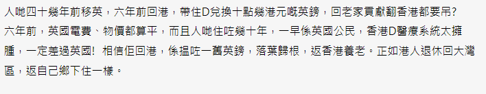 這兩位移英多年又回流香港的案例,隨後在香港網絡引發討論。 一些網友質疑“四十多年才說不習慣?”認為他們應該是在英國面臨高通脹、食物短缺又交不起電費的情況,所以才回流香港。