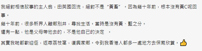 不過也有網友替春哥解釋,稱他走時“沒有黃藍之分,而且是跟隨父母移民的,“歡迎他回來荔枝窩,復興家鄉!”