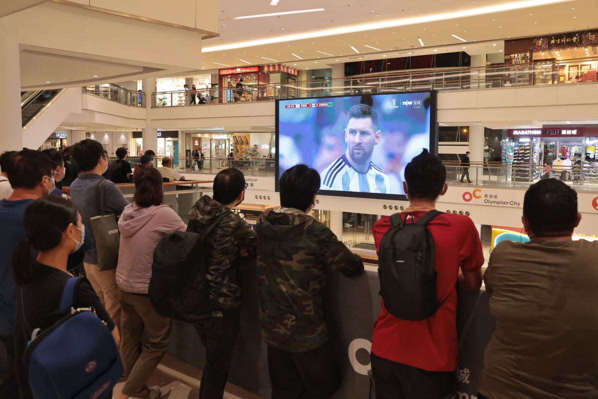 香港中通社圖片 香港時間22日晚上6點,世界盃上演阿根廷與沙特阿拉伯小組賽。即便是工作日晚上,奧海城在世界盃開場前已有球迷到場“佔位”,不少人帶上打氣牌、阿根廷國旗等,還有球迷穿著阿根廷球星梅西的球衣。隨後,商場二、三樓的圍欄前也站滿觀眾。