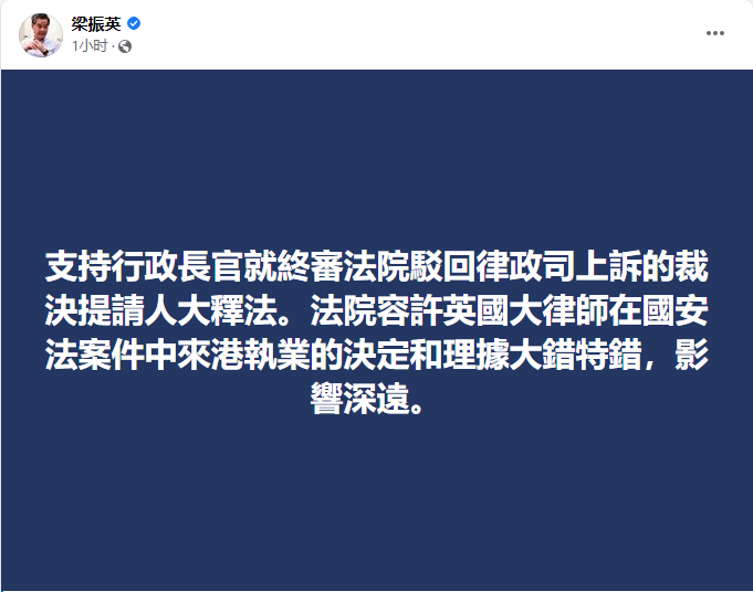 (香港中通社記者 許其皓 攝) 李家超指出,早前收到中央信件,要求就香港維護國家安全提交報告。報告中將提及上述案件,并建議提請全國人大常委會根據《香港國安法》第六十五條作出解釋,以厘清“沒有本地全面執業資格的海外律師或大律師,能否以任何形式參與處理危害國家安全犯罪案件的工作?” 李家超指出,此事件影響深遠,政府作出建議釋法的決定是審慎且嚴肅的,也是為了維護國家安全。他強調,海外律師或大律師基本上在香港是無執業權的,所以這次決定是針對該類型人士,而并非針對國籍。 國務院港澳事務辦公室發言人回應稱,特首根據中央政府指令及時提交報告并提出有關建議,充分體現出作為香港特區“當家人”和“第一責任人”的擔當。黎智英涉嫌“勾結外國或者境外勢力危害國家安全罪”,而香港有關法院批准由英國禦用大律師代理黎智英案,違反香港國安法的立法精神和法理邏輯。 中央人民政府駐香港特別行政區聯絡辦公室發言人指出,國安法實施以來,迅速結束了香港社會動蕩局面,有力推動了香港實現由亂到治重大轉折及保障了香港市民的根本利益。但樹欲靜而風不止,一段時間以來,有外國政府和一些政客對香港國安案件的審理公開插手干預,揚言要對檢控官、法官進行制裁,這是對中國內政及特區事務的粗暴干涉,是對法治原則和精神的肆意踐踏。對此表示強烈譴責和堅決反對。 駐港國家安全公署發言人則對中通社獨家表示,對李家超發表堅定捍衛國家主權、安全、發展利益和香港國安法權威的聲明表示堅決支持。公署將依照香港國安法堅決防範任何涉國家安全風險,兜牢國家安全底線,決不允許國家安全“一孔破窗”。 全國政協副主席梁振英當日在社交平台發文支持特首提出的釋法建議,稱“法院容許英國大律師在國安法案件中來港執業的決定和理據大錯特錯,影響深遠”。