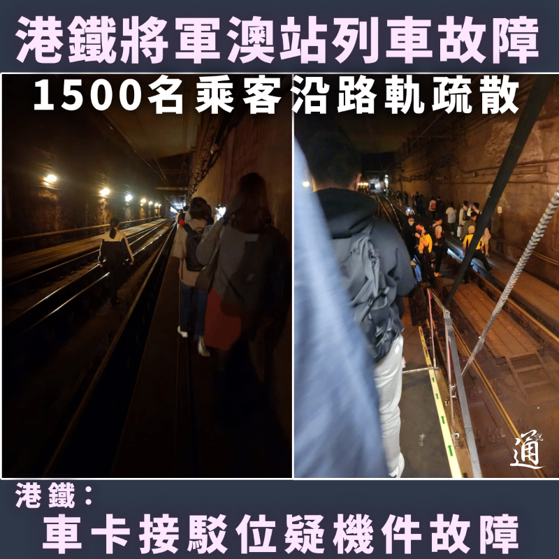 香港新聞網12月5日電 港鐵將軍澳站附近有列車今早出現機件故障,約1500名乘客須沿隧道步行離開,將軍澳綫服務受阻,來往調景嶺至康城站及寶琳站暫停服務。港鐵職員進行搶修,至中午約12時半服務逐步回復正常,港鐵就事件為乘客帶來不便致歉。事件中兩名女乘客不適送院,當中包括一名孕婦。 港鐵表示,今早約8時30分,一列往北角方向的將軍澳綫列車預備駛入將軍澳站時出現機件故障,相關的安全防護裝置發揮作用,於距離車站一段路程制停列車。車長即時通知車務控制中心,車務控制中心在確保安全下,安排車站職員帶領車上約1500名乘客,由車頭緊急出口斜道,沿隧道步行至將軍澳站月台離開。