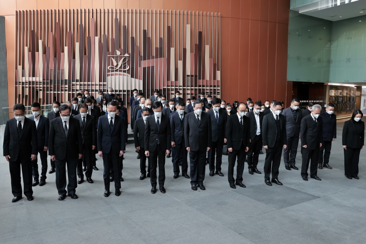香港立法會悼念江澤民 香港中通社圖片 所有政府政策局及部門亦安排員工在追悼大會默哀時,同時默哀三分鐘。 隸屬於多個政府部門,包括漁農自然護理署、香港海關、懲教署、環境保護署、消防處、衞生署、香港警務處、入境事務處及海事處的政府船隻亦在追悼大會默哀時在中區對開海面鳴笛三分鐘。