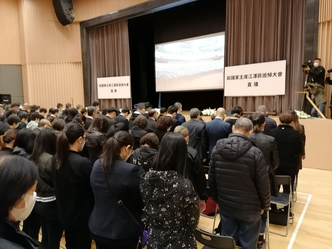 香港中通社圖片 香港特區政府在各區設點直播追悼大會實況。江澤民追悼會期間,政府部門、立法會、司法機構等同步默哀,法院休庭3分鐘。政府船隻於中區對開海面鳴笛3分鐘,維港笛聲長鳴。