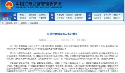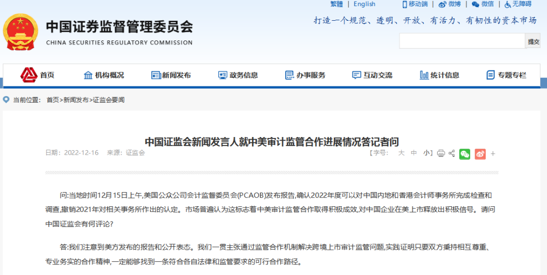 中國證監會官網截圖 中國證監會新聞發言人16日表示,注意到美方發佈的報告和公開表態。“我們歡迎美國監管機構基於監管專業考慮重新作出的認定。”實踐證明只要雙方秉持相互尊重、專業務實的合作精神,一定能够找到一條符合各自法律和監管要求的可行合作路徑。 中國證監會、財政部與美國PCAOB於2022年8月26日簽署的中美審計監管合作協議,合作協議包括三方面重點內容,一是確立對等原則。協議條款對雙方具有同等約束力,中美雙方均可依據法定職責,對另一方轄區內相關事務所開展檢查和調查。二是明確合作範圍。中方提供協助的範圍涉及部分為中概股提供審計服務、且審計底稿存放在內地的香港事務所。三是明確協作方式。美方須通過中方監管部門獲取審計底稿等文件,在中方參與和協助下對會計師事務所相關人員開展訪談和問詢。