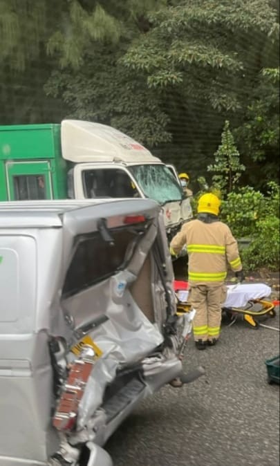 消防趕至現場救援。網圖 事發在今早(16日)9時許,東涌裕東路近東涌交匯處,一輛E36A路線龍運巴士先撞向前方5.5噸貨車,貨車被推前繼而撼向前方的輕型貨車,現場可見,巴士及貨車車頭損毀嚴重,擋風玻璃嚴重碎裂,輕型貨車車尾被撞至凹陷,有3人被捲入貨車車底。消防及警方趕至現場,將傷者救出。當中64歲貨車司機當場死亡,42歲客貨車司機重傷,送院經搶救後證實不治。另有3男7女受傷,年齡介乎至28至94歲,傷者分別送往北大嶼山醫院及瑪嘉烈醫院。 警方表示,貨車及輕型貨車均屬食環署外判清潔公司,事發時正停泊在路邊,有4名工人在路邊進行清潔工作,2人在貨車上休息。警方事後以涉嫌危險駕駛,拘捕涉案的28歲巴士司機。巴士司機入職2年半,駕駛涉事路線已經兩個月,當時是其開工後第二轉車,現場未見有煞車痕或工程指示牌,警方正循巴士司機精神狀況等進行調查。 龍運巴士表示,十分關注事件,公司對死者和家屬致以深切哀悼和慰問,已派職員到現場及醫院了解情況,會對傷者及家屬提供適切協助,並全力配合警方的調查。 運輸署在今早9時55分表示,因交通意外,裕東路(往北大嶼山醫院方向)近東涌東交匯處的全線現已封閉。同時,東涌東交匯處的部分行車線現已封閉。 【編輯:孟宜君】