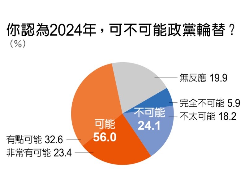 台灣遠見雜誌最新民調指,“九合一”選舉結束後,民眾持續看衰綠營執政表現,有56%的民眾認為2024年大選可能發生政黨輪替,民進黨將下台。遠見雜誌分析認為,2024年很可能出現台灣歷史上第4次政黨輪替。
