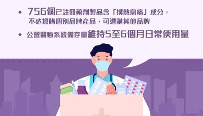 撲熱息痛可用於止痛及退燒。根據紀錄,本港現時有756個已註冊的藥劑製品含有撲熱息痛成分。巿民可於衞生署藥物辦公室網頁利用“香港註冊藥劑製品搜尋”功能(按此),以產品的英文名稱或成分,搜尋有關已註冊藥劑製品的資料。 根據《藥劑業及毒藥條例》(第138章),所有“藥劑製品”必須符合安全、療效及素質標準,並獲香港藥劑業及毒藥管理局批准註冊,方可在港銷售。已註冊的藥劑製品會在包裝上印有“HK-XXXXX”樣式的香港註冊號碼。 政府發言人提醒市民,在使用任何藥物之前應先徵詢醫護人員的意見,並應避免自行購買藥物使用。市民不需要囤積任何藥物,包括“撲熱息痛”成分藥物。(完) 【編輯:孟宜君】