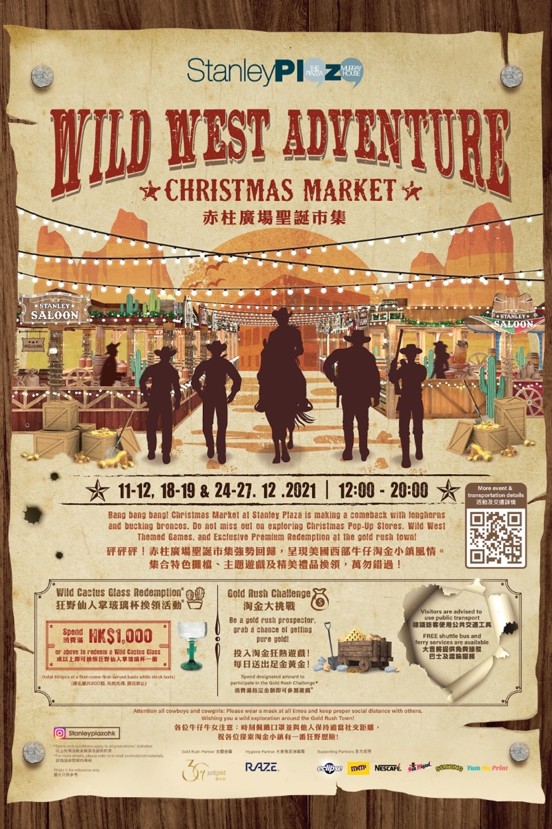赤柱廣場於12月11日起一連三個星期六、日及公眾假期打造“Wild West Adventure聖誕市集”,呈現美國西部牛仔淘金小鎮風情,集合超過60個特色攤檔、主題遊戲及精美禮品換領,現場會有多個人氣品牌、聖誕精品、手作及美食。赤柱聖誕市集還設有模擬淘金遊戲,參加者於限時內進行淘金,每個活動日的勝出者可獲得由justgold鎮金店送出的純金吊墜。柱廣場亦特別設計三款主題線上遊戲,完成達標即可獲贈禮品。