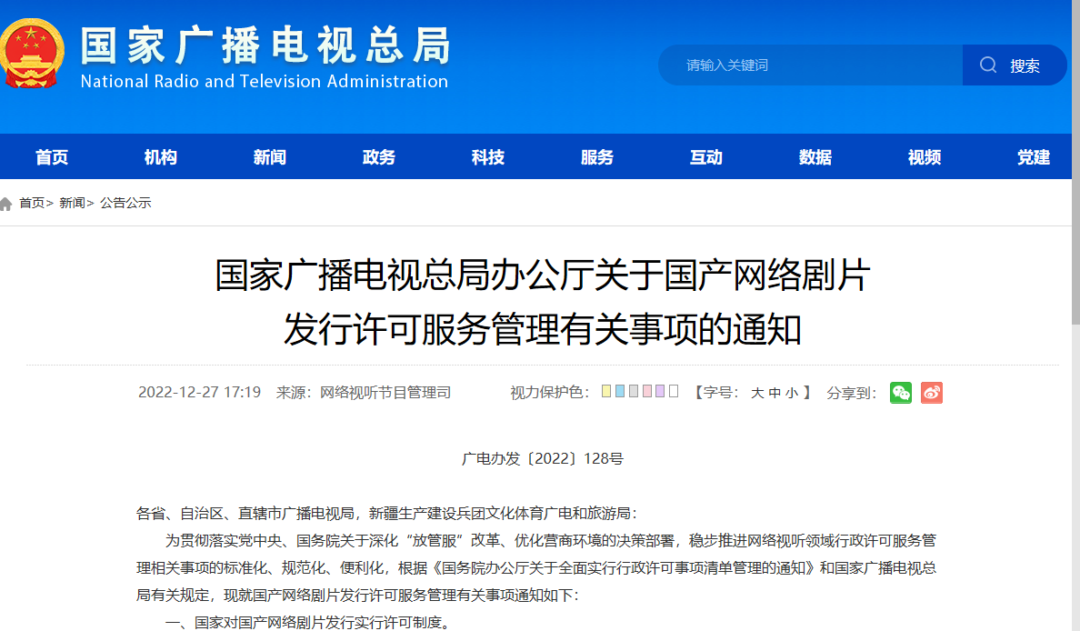 圖源:國家廣播電視總局官網 通知原文如下: 為貫徹落實黨中央、國務院關於深化“放管服”改革、優化營商環境的決策部署,穩步推進網絡視聽領域行政許可服務管理相關事項的標準化、規範化、便利化,根據《國務院辦公廳關於全面實行行政許可事項清單管理的通知》和國家廣播電視總局有關規定,現就國產網絡劇片發行許可服務管理有關事項通知如下: 一、國家對國產網絡劇片發行實行許可制度。 二、國務院廣播電視主管部門負責受理持有《廣播電視節目製作經營許可證》的中央單位及其直屬機構等提出的申請,省級廣播電視主管部門負責受理本轄區內廣播電視播出機構、廣播電視節目製作經營機構等提出的申請。 三、國務院廣播電視主管部門負責制定國產網絡劇片發行許可實施規範。廣播電視主管部門依照實施規範制定相應的辦事指南。各省級廣播電視主管部門應嚴格遵照辦事指南,加強本地區國產網絡劇片許可管理,結合工作實際,采取有針對性的措施,推進相關政務服務標準化、規範化、便利化。 四、廣播電視主管部門應不斷完善國產網絡劇片事前事中事後全鏈條監管。根據互聯網規律特點和網絡劇片管理工作實際,廣播電視主管部門采取分級監管、重點監管、動態監管、主體監管相結合的策略,實施有針對性、差異化、精準化的管理措施。 五、廣播電視主管部門對國產重點網絡劇片實施重點監管。符合以下一項或多項條件的網絡劇、網絡微短劇、網絡電影、網絡動畫片,應依法取得廣播電視主管部門頒發的《網絡劇片發行許可證》: 1.投資額較大的,具體數額由國務院廣播電視主管部門根據網絡視聽行業發展和管理工作實際,適時調整并通報; 2.網絡視聽節目服務機構招商主推的; 3.在網站(客戶端)首頁首屏、專題版塊或專區專欄中推薦播出的; 4.優先提供會員觀看或以付費方式提供觀看服務的; 5.網絡劇片製作發行主體自願按照重點網絡劇片申報的。 六、國產重點網絡劇片上線播出時,應使用統一標識,準確標注節目發行許可證號,固定於節目片頭的顯著位置展示。 七、本通知第五條規定之外的國產網絡劇片,網絡視聽節目服務機構應嚴格履行主體責任,實行先審後播的管理制度,落實總編輯內容負責制等管理要求,建立健全完善有效的審核把關機制。廣播電視主管部門應切實加強對擬上線內容的抽審和監看,并加強對網絡視聽節目服務機構播出行為的監管。 八、製作、播出重大題材或者涉及政治、軍事、外交、國家安全、統戰、民族、宗教、司法、公安等特殊題材的國產網絡劇片,應當征求省級以上人民政府有關主管部門或有關方面的書面意見。 九、廣播電視主管部門支持鼓勵優秀國產網絡劇片的創作播出。對納入中央和省級黨委政府、宣傳管理部門重點扶持計劃的國產網絡劇片,視情采取開闢許可審查受理綠色通道、加強全程指導幫助、發放扶持資金、推薦評優評獎、積累製作發行主體信譽等多種方式,予以重點關注和支持。 十、廣播電視主管部門應認真貫徹落實意識形態工作責任制要求,從積極防範應對網上意識形態風險隱患不斷變化的工作需要出發,加強對網上播出的網絡劇片的風險預判、動態調控與監管。對發生問題的網絡劇片,及時采取有效管理措施。 十一、國產重點網絡劇片許可發行服務管理的條件、標準、措施、做法等,結合網絡劇片內容管理工作發展的實際,視情向其他網絡劇片延伸適用。 十二、網上播出的國產電視劇片,應當持有《電視劇片發行許可證》(名稱待定),符合國家有關廣播電視節目和網絡視聽節目的相關管理規定。 十三、國務院廣播電視主管部門或者省級廣播電視主管部門可以根據公共利益的需要,對網絡視聽節目服務機構播出的網絡劇片進行調控,可以做出臨時停播、延期播出、要求修改等決定。 十四、上述要求自2022年6月1日起實施。2022年5月31日(含)之前通過廣播電視主管部門網絡劇片內容審核的,按原有管理要求執行。(完) 【編輯:錢林霞】