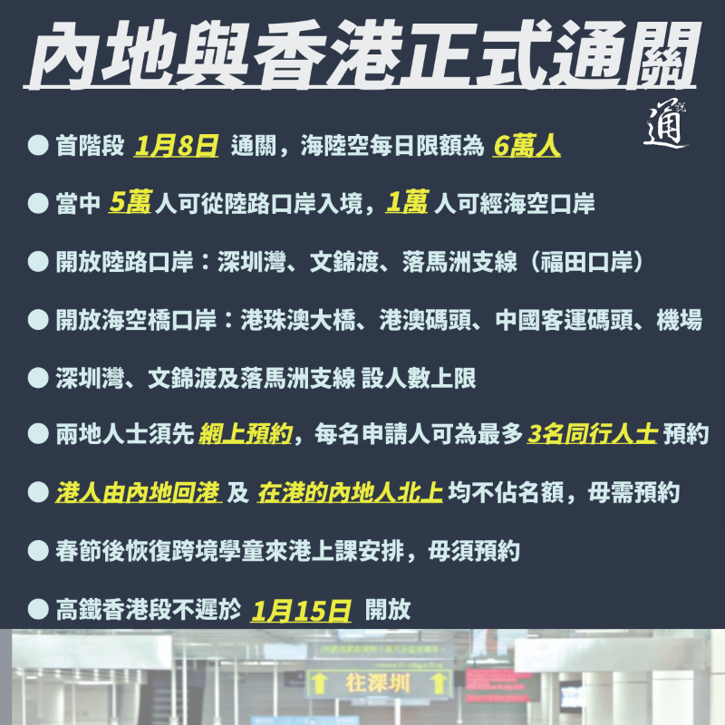 香港新聞網1月5日電 等了三年,終於等到了內地與香港“通關”的好消息!香港行政長官李家超今日(5日)宣布,兩地將於1月8日首階段通關,屆時將開放深圳灣口岸、落馬洲口岸、文錦渡口岸、港珠澳大橋、機場、港澳碼頭及中國客運碼頭,共7個口岸。