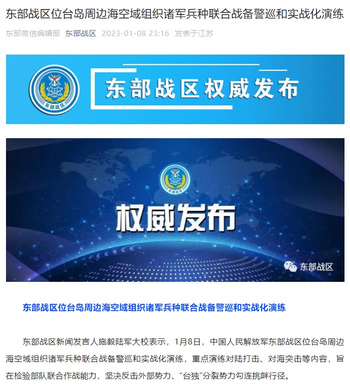 香港新聞網1月9日電 中國人民解放軍東部戰區新聞發言人施毅陸軍大校表示,1月8日,中國東部戰區位台島周邊海空域組織諸軍兵種聯合戰備警巡和實戰化演練,重點演練對陸打擊、對海突擊等內容,旨在檢驗部隊聯合作戰能力,堅決反擊外部勢力、“台獨”分裂勢力勾連挑釁行徑。