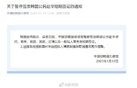香港新聞網1月10日電 刚刚,中國駐韓國大使館發佈關於暫停簽發韓國公民赴華短期簽證的通知。詳情如下: 根據國內指示,自即日起,中國駐韓國使領館暫停簽發韓國公民赴華訪問、商務、旅遊、就醫、過境以及一般私人事務類短期簽證。 上述措施將視韓國對華歧視性入境限制措施取消情況再作調整。 中國駐韓國大使館 2023年1月10日