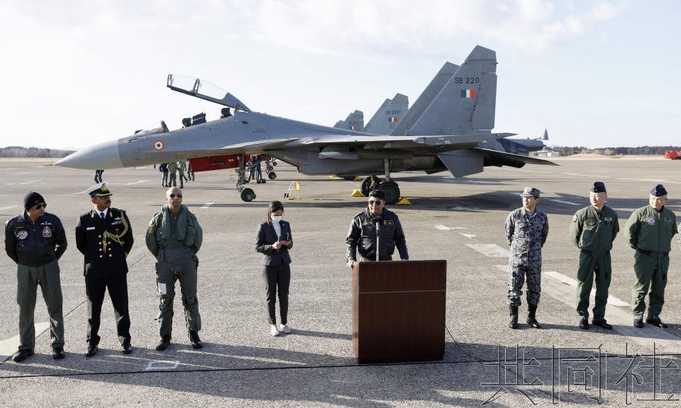 印度空軍卡皮爾上校(中)在日本航空自衛隊百里基地舉行記者會。圖源:共同社 日方以噴射水弧的“水門禮”歡迎抵達的戰機。雙方的部隊指揮官舉行記者會,表明將強化防衛合作。百里基地司令石村尚久空將補指出:“能够實施聯合訓練有很深的歷史性意義,期待進一步深化關係。”印度空軍的卡皮爾上校強調:“這將是強化長期友好關係、深化兩國戰略關係的新台階。” 日本航空自衛隊將派出4架F-2和4架F-15戰機參與訓練。印度空軍派出150人參與此次聯合訓練,另有4架蘇-30戰機和2架C-17運輸機以及1架空中加油機。(完) 【編輯:王軼南】