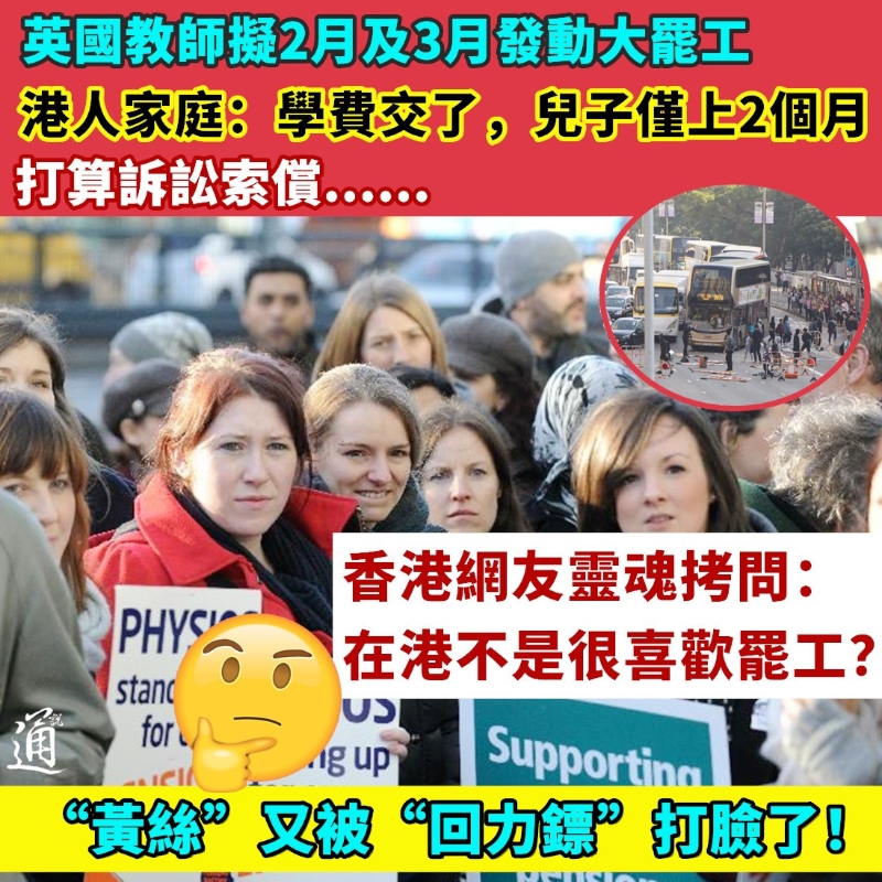 (製圖 劉春) 滿心以為子女抵英後接受的是“優質的英式教學”,卻未曾想獲得的盡是罷工帶來的“震撼教育”。因此,聽聞英國教師又計劃大罷工後,該港媽決定不忍了! 她透露,聽聞英國約2萬名大學生正進行集體訴訟,要求帝國理工學院、倫敦政治經濟學院等18間大學賠償因教職員罷工造成的損失,退還部分學費。該港媽認為追討合理,正考慮讓兒子亦加入索償行動。 一些港人家庭在英國慘成“冤大頭”、錢也打了水漂的消息其後於香港網絡流傳開,香港網友的反應卻是…… “在香港不是很喜歡罷工?”有網友回憶起香港“修例風波”期間,“黃絲”積極參與所謂“大三罷”的擾民行動,諷刺移英“黃絲”持雙重標準:“(在)香港搞三罷又這麼支持!雙標!” 也有網友直指“黃絲”又被“回力鏢”打臉了,當日“黃絲”種下的罷工惡果,如今輪到他們自己品嚐了。 還有香港網友揶揄,英國罷工是一道“美麗的風景線”,支持英國人“罷工的自由”。