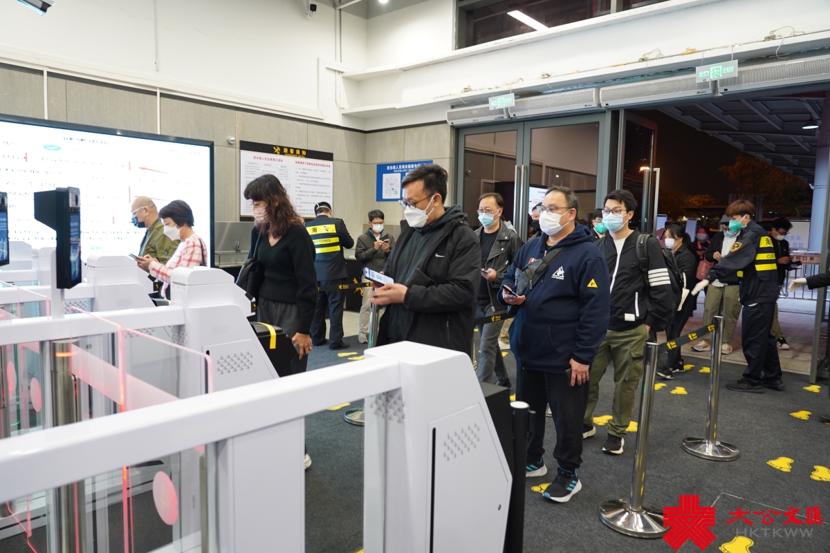 香港新聞網2月6日電 今天(2月6日)零時起,全面恢復內地與港澳人員往來,當中24小時服務的落馬洲/皇崗口岸,率先實施免檢測、免限額“通關”。凌晨零時左右,已經有一批市民及旅客抵達香港的新田皇巴站,等候乘搭頭班車過關。