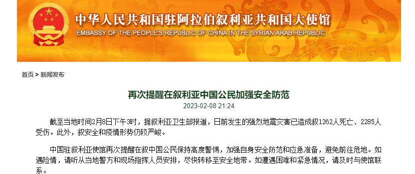 中國駐叙利亞使館官網截圖 中國駐叙利亞使館2月8日再次提醒在叙中國公民保持高度警惕,加強自身安全防範和應急準備,避免前往危地。如遇險情,請聽從當地警方和現場指揮人員安排,盡快轉移至安全地帶。如遭遇困難和緊急情況,請及時與使館聯繫。 叙利亞報警電話:112 叙利亞急救電話:110 中國駐叙利亞使館領事保護與協助電話:+963-944265018 外交部全球領事保護與服務應急呼叫中心熱線:+86-10-12308或+86-10-65612308(完) 【編輯:王軼南】