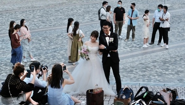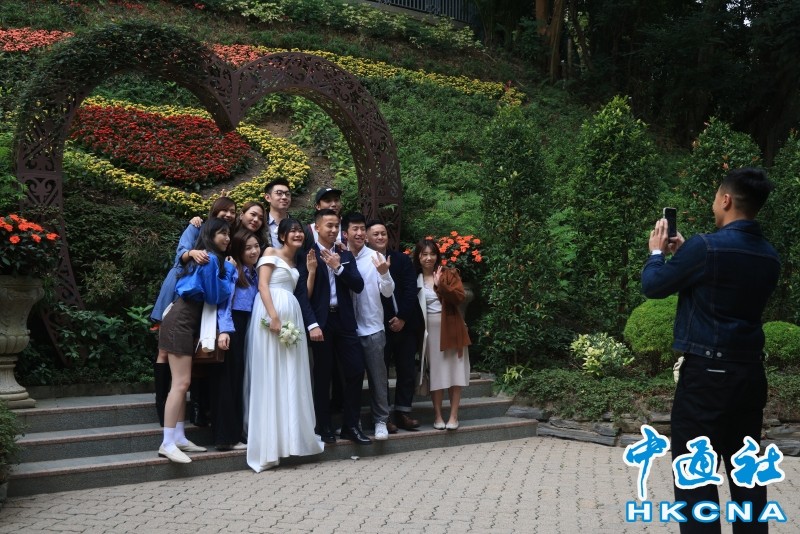 香港中通社2月14日電(記者 張明臻)“來,除口罩,一、二、三!新婚快樂。”2月14日情人節,香港紅棉路婚姻登記處外,一對對身穿禮服的新婚夫婦,在親朋簇擁下合影記錄下歡喜一刻。祝福聲此起彼伏,這是疫情三年後,難得可真正慶祝的一次情人節。 2023年恰逢雙春兼閏月,傳統上是婚嫁好時年,更有機會明年生“龍寶寶”。今年亦是香港三年疫情以來,大部社交距離措施放寬下的首個情人節。 這一日亦是“宜嫁娶”,香港共有248對准新人結婚,較去年增一倍,業界料婚嫁市場生意增三成。