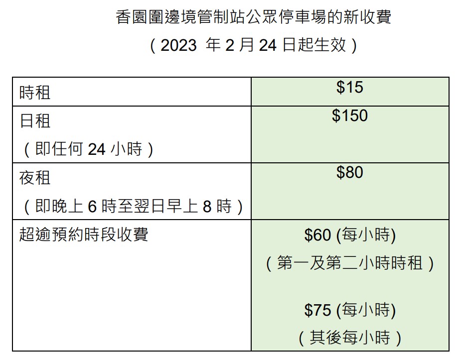 香港新聞網2月15日電 鑑於香園圍邊境管制站的公眾泊車位需求殷切,政府發言人今日(2月15日)表示,政府正致力以多管齊下的方式,包括調整香園圍邊境管制站公眾停車場(管制站公眾停車場)的預約安排和泊車收費,及增加口岸附近的泊車位數量,以便利市民利用香園圍/蓮塘口岸往返內地及香港。 管制站公眾停車場優化措施 政府產業署(產業署)經檢視管制站公眾停車場的泊車情況,決定推行優化措施,以確保該停車場的運作暢順,包括: (一)管制站公眾停車場由2月17日起,只接受經網上預約的車輛停泊,不再接受未經預約的車輛。預約系統會在2月17日0時01分起恢復運作;及 (二)為減少車輛停泊超逾其預約時段的情況,泊車收費包括額外泊車收費(即實際離場時間遲於預約離場時間)將作出調整。新收費將由2月24日起生效。新收費詳情可參閱以下表格。