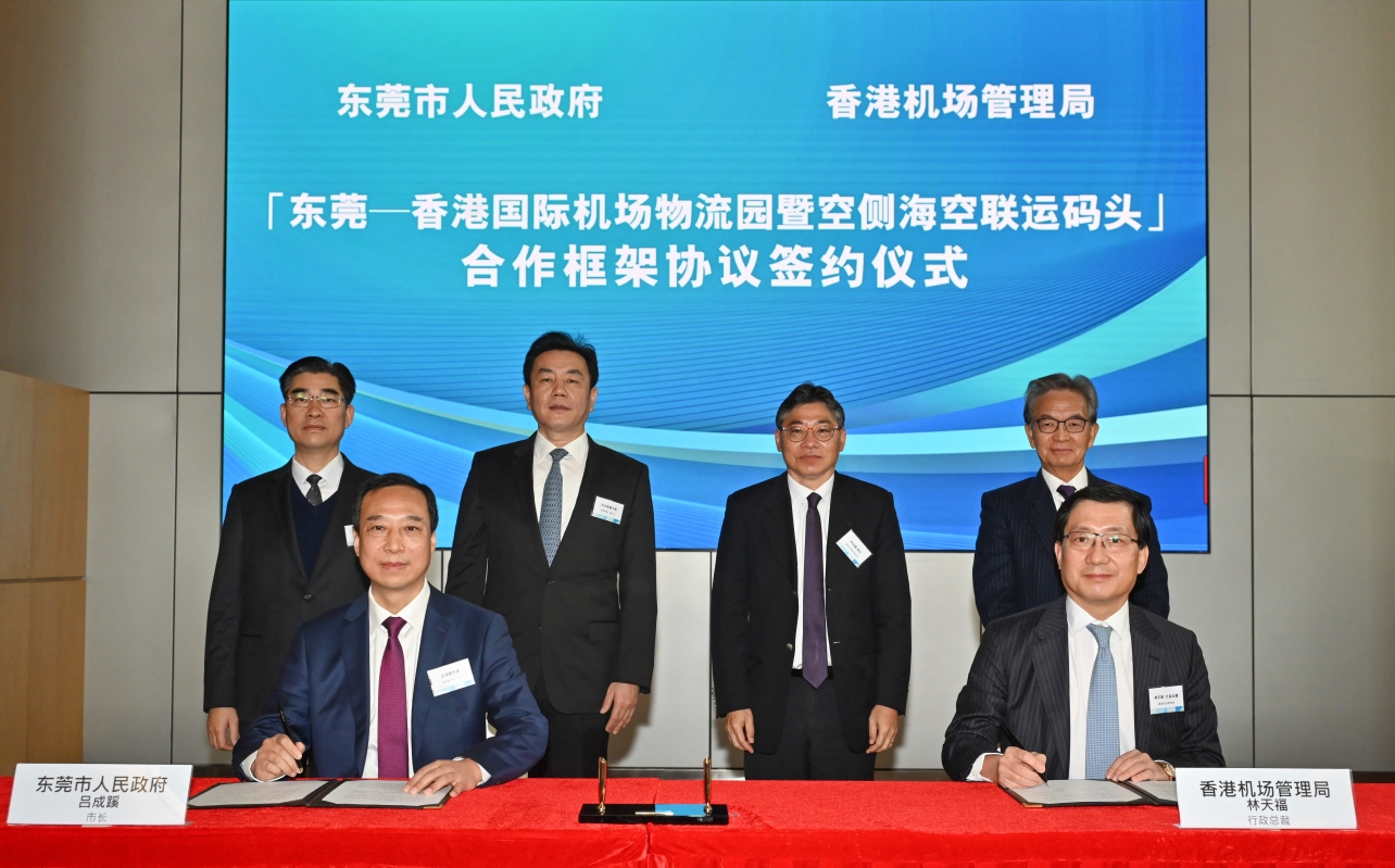 香港新聞網2月16日電 香港機場管理局與東莞市人民政府今日(16日)簽署《關於“東莞—香港國際機場物流園暨空側海空聯運碼頭”項目的合作框架協議》,落實和促進兩地之間“海空貨物聯運”模式的長遠發展。