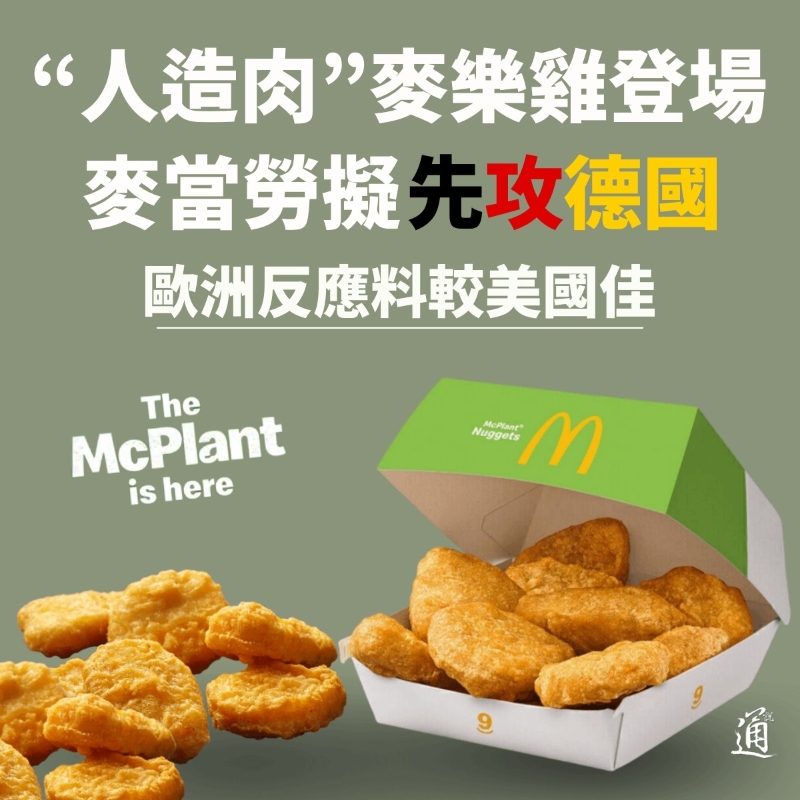 麥當勞將在德國全國推出人造肉麥樂雞(製圖:黃璇) 歐洲反應料較美國佳 綜合媒體報道,麥當勞在德國史特加9家餐廳試推後,下周將於德國全國1,400多家麥當勞推出人造肉麥樂雞,而人造肉漢堡也會同步售賣。外界普遍預期歐洲消費者會比美國消費者更容易接受人造肉產品,而目前在英國、愛爾蘭、奧地利和荷蘭的麥當勞,亦有將人造肉漢堡保留在菜單上。 不過,美國消費者對於人造肉產品的反應則較差。事實上,麥當勞和Beyond Meat於去年已結束在美國測試人造肉漢堡,而且沒有宣布任何進一步推出的計劃。據BTIG分析師Peter Saleh在去年6月一份報告中更指,有關產品銷量令人失望。