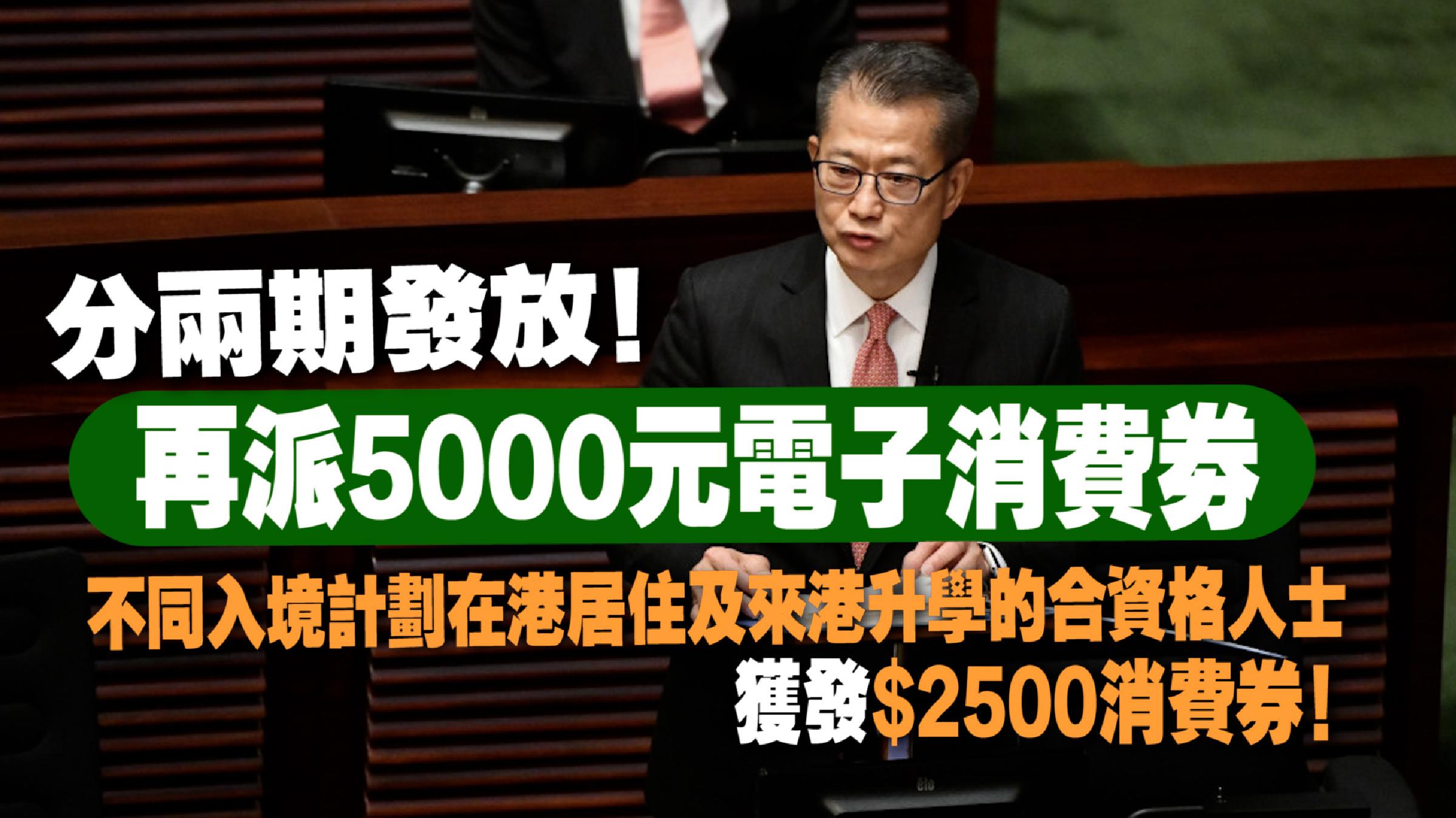 香港新聞網2月22日電 香港財政司司長陳茂波今日(22日)發表新一份《財政預算案》,宣布會向合資格市民分兩期發放共5000元消費券。首期3000元會在4月發放,其餘2000元則在今年年中發放。 陳茂波表示,政府於過去兩年推行了兩輪消費券計劃,分別向超過600萬名合資格市民發放5000元及1萬元電子消費券。社會反應正面。因此考慮了當前經濟、社會民生及政府財政狀況後,今年會再向每名合資格的18歲或以上永久性居民及新來港人士分兩期發放總額5000元電子消費券。 他說,為盡快發放消費券,政府會先通過去年計劃的登記資料,在今年4月發放首3000元消費券給合資格人士,餘額會與新符合資格人士一起在今年年中發放。與去年安排一樣,透過不同入境計劃在港居住及來港升學的合資格人士,會獲發上述總額一半,即合共2500元的消費券。會盡快公布詳情。