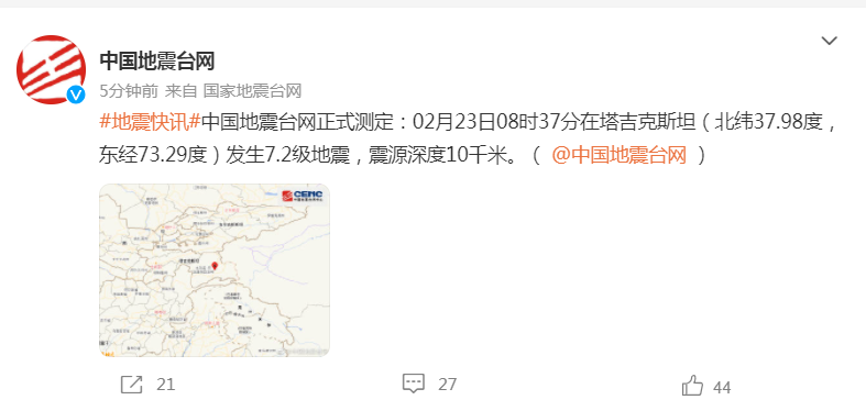 香港新聞網2月23日電 據國家地震台網官方微博消息,中國地震台網正式測定:02月23日08時37分在塔吉克斯坦發生7.2級地震,震源深度10千米。震中位於北緯37.98度,東經73.29度,距我國邊境線最近約82公里。震中5公里范围内平均海拔约4655米。  (完)
