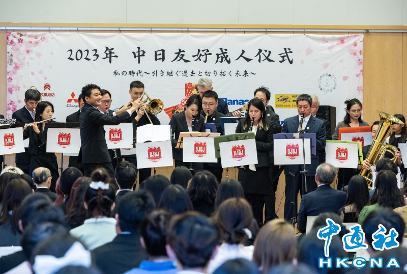 •   2月25日,2023年中日友好成人儀式在北京舉行。這是該項友好交流活動時隔三年再次舉辦。圖為主要由中日兩國友人組成的“BJBJ”吹奏樂隊在活動上進行表演。 香港中通社圖片