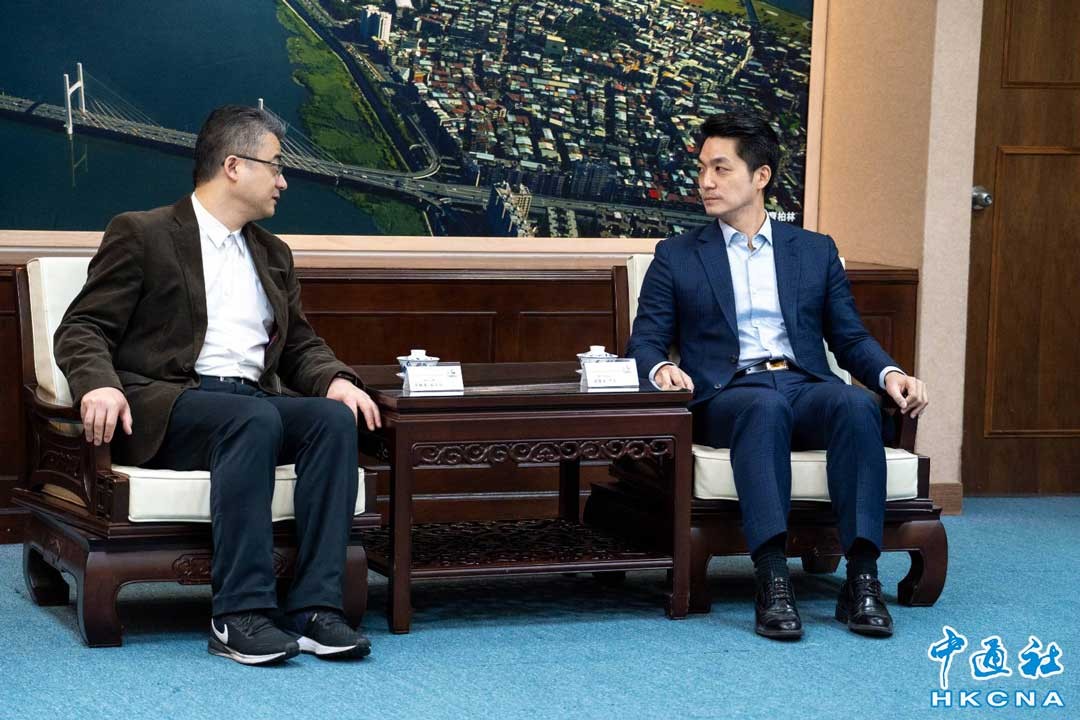上海市台辦副主任李驍東(左)一行六人18日抵台拜會台北市政府,並參訪台灣燈會,20日早上台北市長蔣萬安(右)與上海團進行座談。香港中通社圖片