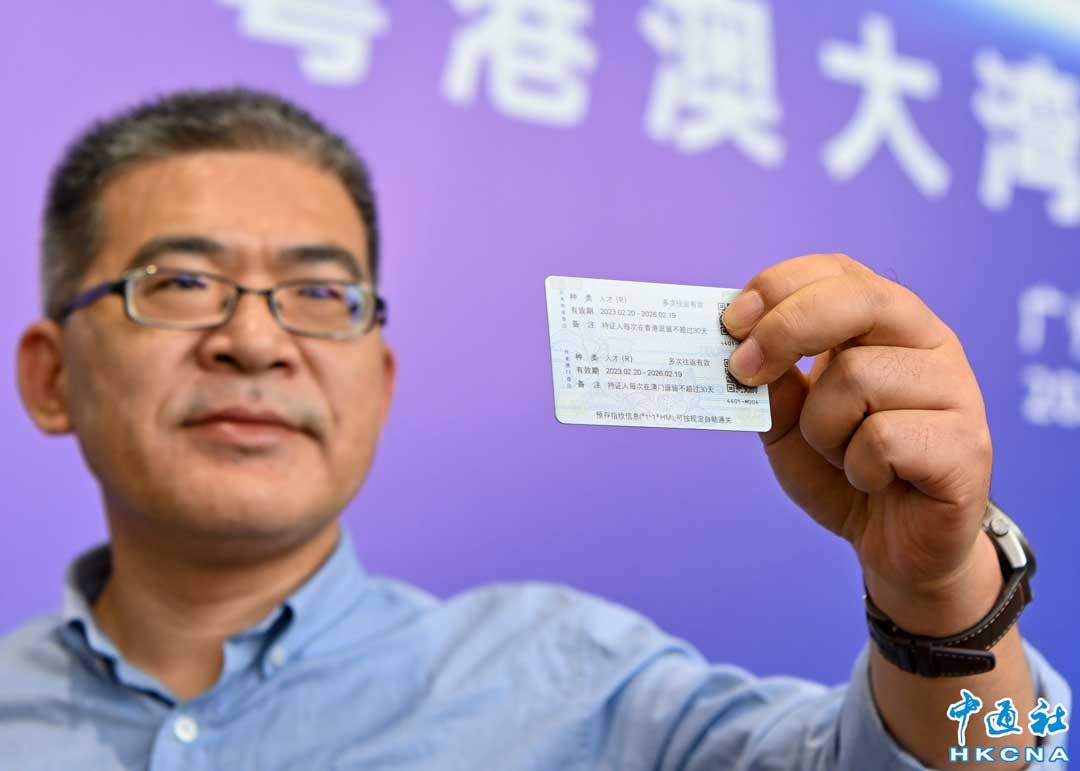 為便利粵港澳大灣區人才從事科研學術等交流活動,促進服務粵港澳大灣區建設發展,中華人民共和國出入境管理局決定,自2023年2月20日起在粵港澳大灣區內地城市試點實施往來港澳人才簽注政策。圖為獲得往來港澳人才簽注的中山大學南沙研究院常務副院長張湘東展示人才簽注的有效期。香港中通社圖片