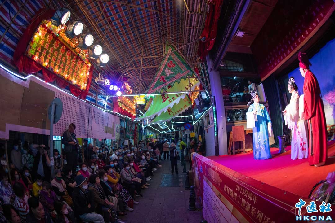 2月20日,市民觀看神功戲。為慶祝土地誕,澳門雀仔園福德祠土地廟值理會19日起一連五天舉行土地誕神功戲,吸引不少市民到場觀看,場面相當熱鬧。香港中通社圖片