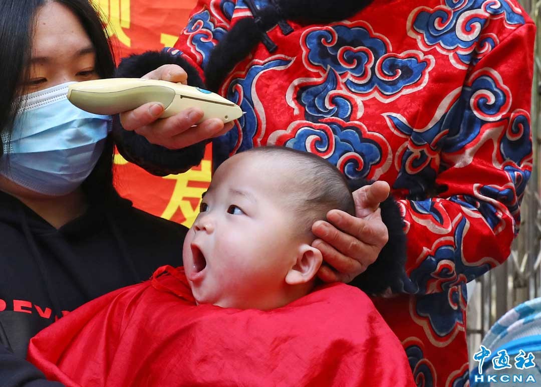 2月21日,江西南昌,理髮師正在給嬰兒理發。當天是中國農曆二月初二,民間有“二月二龍抬頭”理髮的習俗,寓意鴻運當頭。 香港中通社圖片