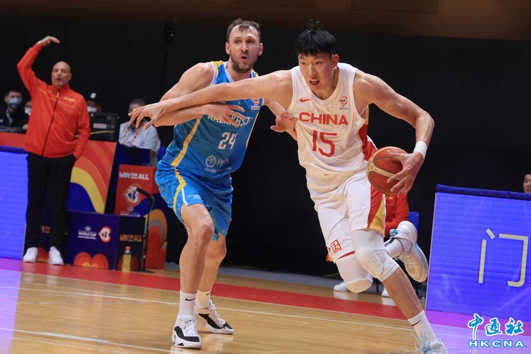 2月23日,2023國際籃聯籃球世界盃亞大區資格賽於在香港舉行,中國男籃國家隊(白)主場迎戰哈薩克斯坦隊(藍)。圖為中國隊球員周琦(白衣15號)在比賽中持球進攻。(香港中通社記者 許其皓攝)