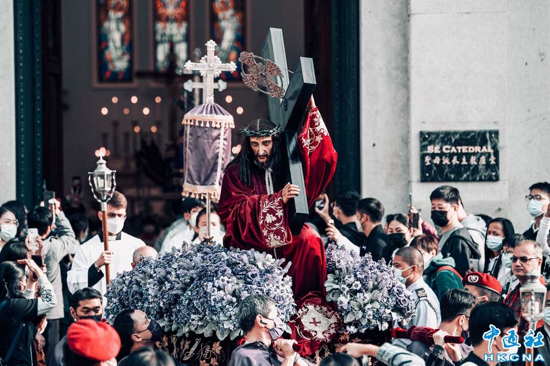 2月26日,“苦難善耶穌聖像巡遊”在澳門主教座堂舉行,背上十字架的“大耶穌”聖像緩緩前行,警察銀樂隊沿途奏樂,大批信眾護送耶穌聖體,巡遊隊伍浩浩蕩蕩,氣氛莊嚴。香港中通社圖片