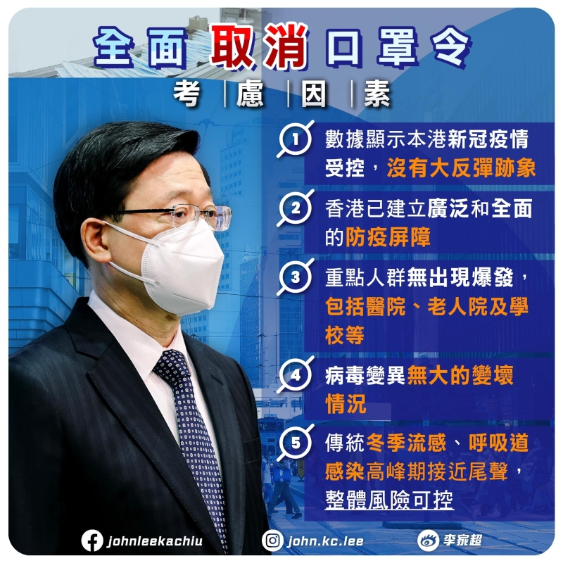 港府:香港明天起全面取消口罩令分享到: