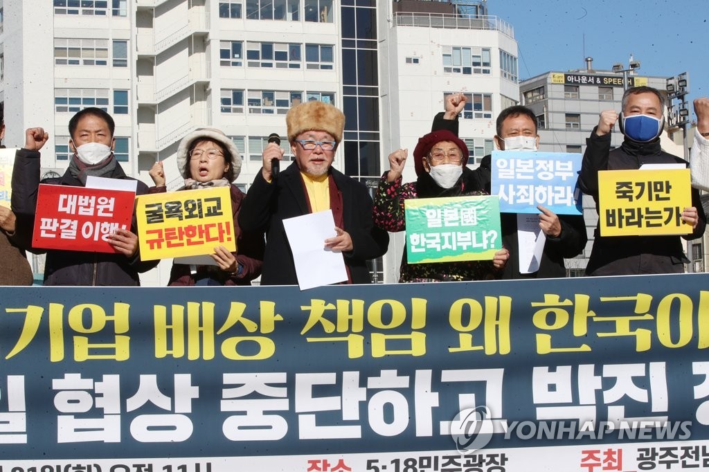 1月31日,強征勞工受害者支援團體示威譴責韓國政府提出的索賠方法。圖源:韓聯社 據韓國強征勞工受害者支援團體的消息,由政府直接與索賠訴訟的受害者遺屬會面尚屬首次。過往政府均通過民官協商會議機制等與受害者支援團體、訴訟代理人保持溝通。 這次會面以早前已獲終審宣判的3起案件的受害者遺屬為對象。這些受害者被強擄到日本制鐵、廣島三菱重工做苦役。韓國政府強調在尋找強征勞工索賠問題解決辦法的過程中,希望日本政府拿出誠意,敦促涉案日企籌措賠償金并向受害者道歉。政府還將就由第三方代付賠償的方案聽取意見。