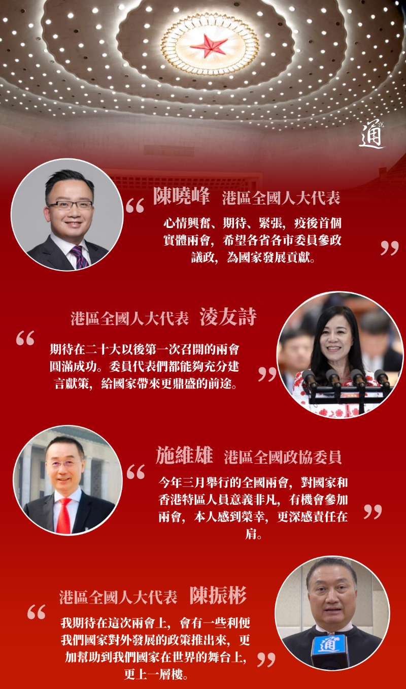 充分建言獻策 為國家帶來鼎盛前途 港區全國人大代表淩友詩表示,期待在二十大以後第一次召開的兩會圓滿成功。委員代表們都能夠充分建言獻策,給國家帶來更鼎盛的前途。 港區全國人大代表陳振彬表示,期待在這次兩會上,會有一些利便我們國家對外發展的政策推出來,更加幫助到我們國家在世界的舞台上更上一層樓。