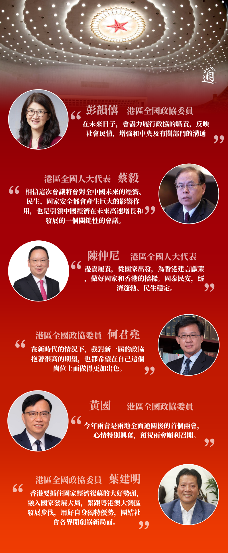 引領內地及香港經濟未來高速增長 港區全國人大代表蔡毅表示,相信這次會議將對中國未來的經濟、政治、民生、外交、國家安全產生巨大的影響,也是引領內地和香港經濟在未來高速增長和發展的關鍵性的會議。 港區全國政協委員彭韻僖表示,參與全國政協工作是個人榮幸。在未來日子,會盡力履行政協的職責,反映社會民情,增強和中央及有關部門的溝通。現時中國面對很多挑戰,但解決問題的方法總比問題多。希望作出研究、提案及建議,幫助施政。