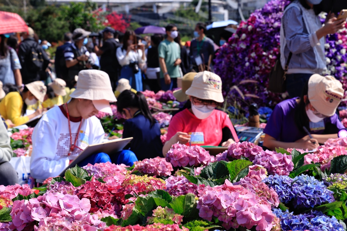 香港中通社記者 曹文毓 攝 今年花展以花形嬌美獨特的綉球花為主題花,并以“綉麗綻放、幸福滿載”為主題。