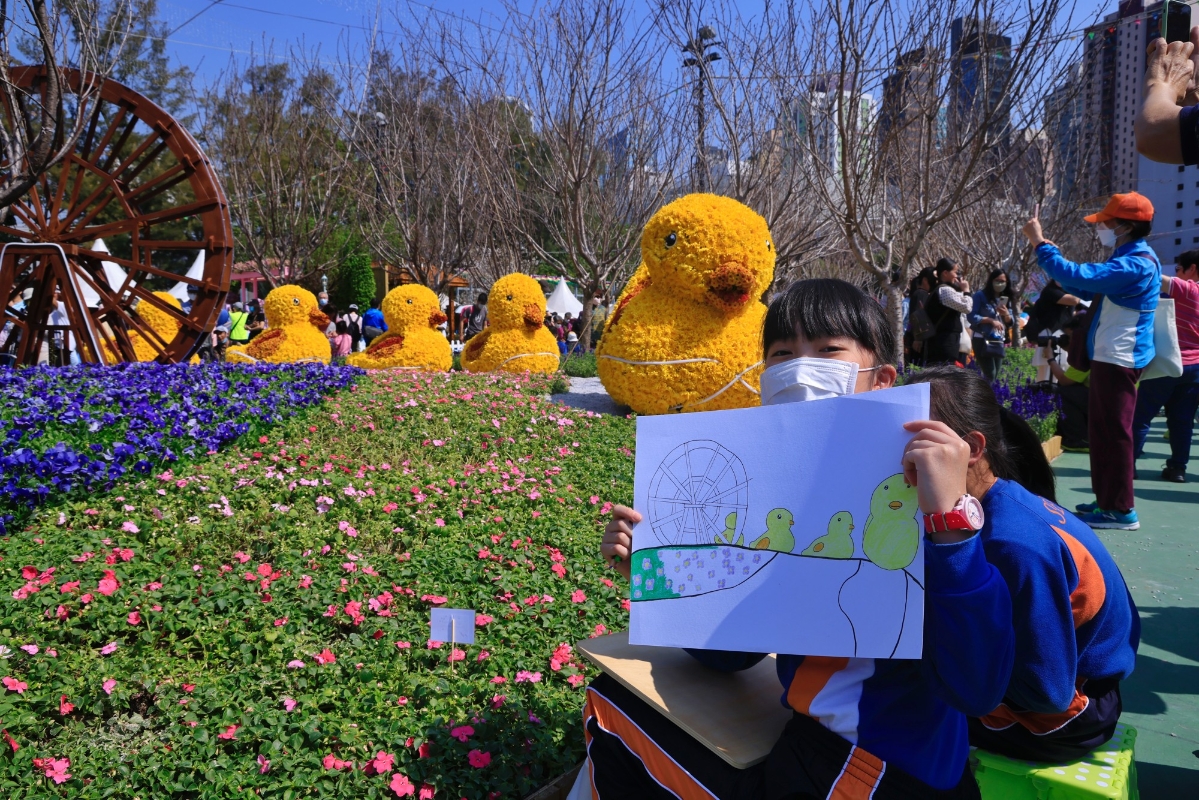 香港中通社記者 曹文毓 攝 在絡繹不絕的人群中,不乏手持“長槍短炮”的中外攝影師,記錄下現場熱鬧的氣氛;亦有學生坐在樹蔭下,聚精會神地繪畫眼中的花卉展。