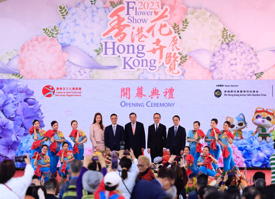 香港中通社記者 曹文毓 攝 在花卉展開幕禮上,香港特區政府文化體育及旅游局局長楊潤雄以花寄寓:綉球花花語有希望、美滿及團聚的意思,非常配合香港現時的情況和願景。花展複辦,香港複常之路又再前進一步;花展亦迎客來,為中外參展團體提供交流機會,以花會友。