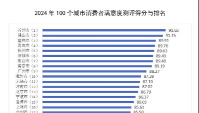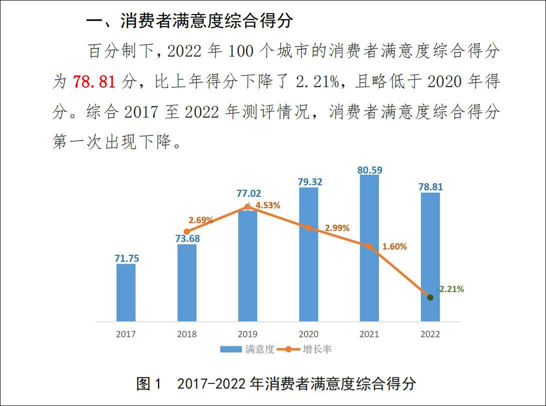 百城消費者滿意度:蘇州第一,前十還有哪?香港新聞網3月14日電 中消協14日發佈《2022年100個城市消費者滿意度測評報告》(下稱報告)顯示,2022年全國100個城市消費者滿意度綜合得分為78.81分,蘇州市位居100個城市消費者滿意度綜合得分第1名,衡陽市位列最末位,三亞市排名倒數第五。 百城消費者滿意度綜合得分78.81 據介紹,中消協自2017年以來持續開展消費者滿意度測評工作。測評將“消費者滿意度”定義為消費者購買商品或接受服務過程中,對消費供給、消費環境和消費維權的情緒反饋,是以百分制的形式測度出來的消費者主觀感受。 根據報告,盡管受到疫情衝擊影響,2022年度100個城市消費者滿意度綜合得分為78.81分,整體處於良好水平。 3個一級指標中,“消費供給”得分最高,為80.54分;“消費環境”得分次之,為78.92分;“消費維權”指標得分為77.53分,與往年得分趨勢保持一致,消費市場韌性強、潛力足的特點沒有發生變化。