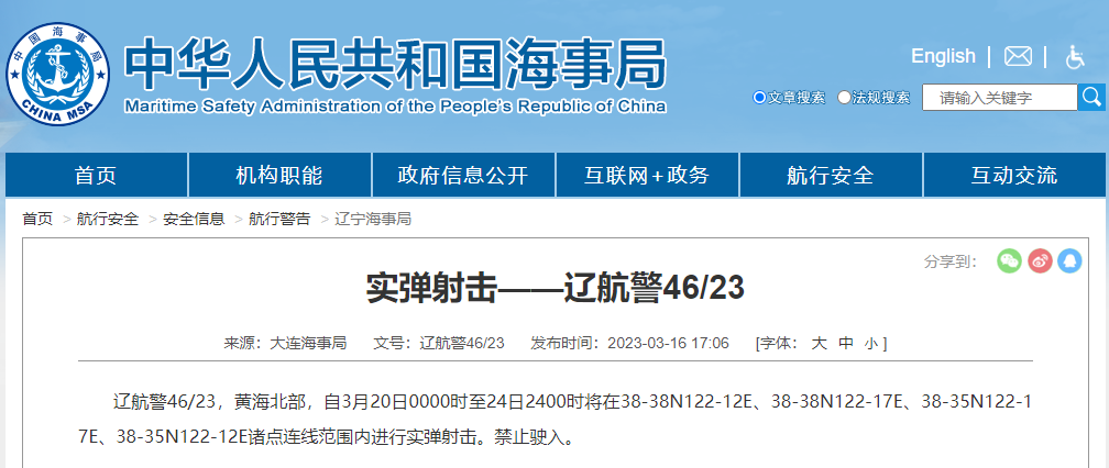 中國海事局官网截图 此前,大連海事局發佈航行警告,顯示解放軍2月13日早上8時至2月17日下午4時,將在黃海北部海域進行實彈射擊;2月12日下午4時至2月19日下午4時,則在渤海海峽黃海北部執行軍事任務。 (完) 【編輯:王軼南】