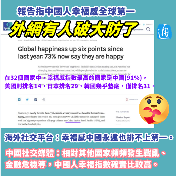 香港新聞網3月21日電 國際知名民調機構益普索集團(Ipsos)日前發佈的調查報告顯示,在32個國家中,幸福感指數最高的國家是中國(91%),美國則排名14,日本排名29,韓國幾乎墊底,僅排名31。 這一結果在中國社交媒體引發了熱議。受三年疫情與嚴峻國際局勢影響,有人認為這是在捧殺,也有不少人認為,放在當今世界大環境并與其它國家尤其是美日韓等相比,中國人幸福指數確實比較高。 然而在外網上,這一結果卻讓那些見不得中國有一點點好,希望中國天下大亂的人徹底破大防了。