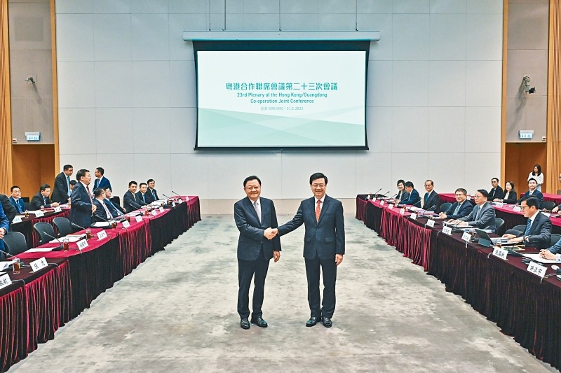 香港新聞網3月22日電 內地與香港全面通關後,粵港兩地政府昨日(21日)在香港舉行粵港合作聯席會議,是4年來首次以實體形式召開,會議由行政長官李家超及廣東省省長王偉中共同主持,雙方在會後共簽署了5份合作協議,涵蓋科技創新、金融、勞工執法培訓、共建智慧城市群,以及藥品醫療器械監管等多方面合作。