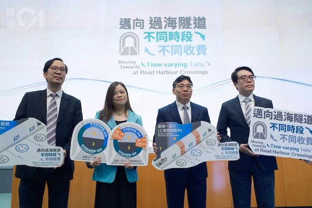 運輸及物流局局長林世雄(右二)、運輸署署長羅淑佩(左二)、運輸及物流局副秘書長麥震宇(左一)及運輸署助理署長/策略研究梁世豪(右一)。(盧翊銘攝) 新修訂後的建議,的士方面劃一25元全日固定收費,而的士乘客若非在過海的士站上車,則須支付去程及回程隧道費、即整段車程合共50元。而商用車輛例如貨車等亦有新收費,日後三隧會劃一只收50元。 運輸署助理署長(策略研究)梁世豪則稱,西隧減價、紅東隧加價後,隧道收費差距會收窄,減少私家車因要選擇較便宜收費隧道而要兜路的情況;的士全日劃一收25元亦可避免無載客的士集中使用紅隧東隧的情況。