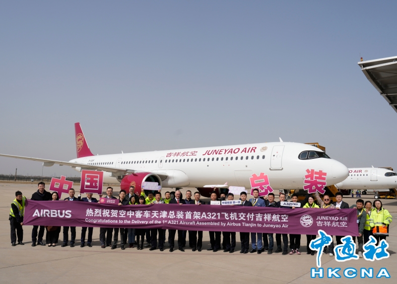 •   3月24日,位於天津港保稅區的空中客車A320系列飛機亞洲總裝線總裝完成的首架A321neo飛機實現交付,該架飛機由吉祥航空接收運營。圖為交付儀式。 香港中通社圖片