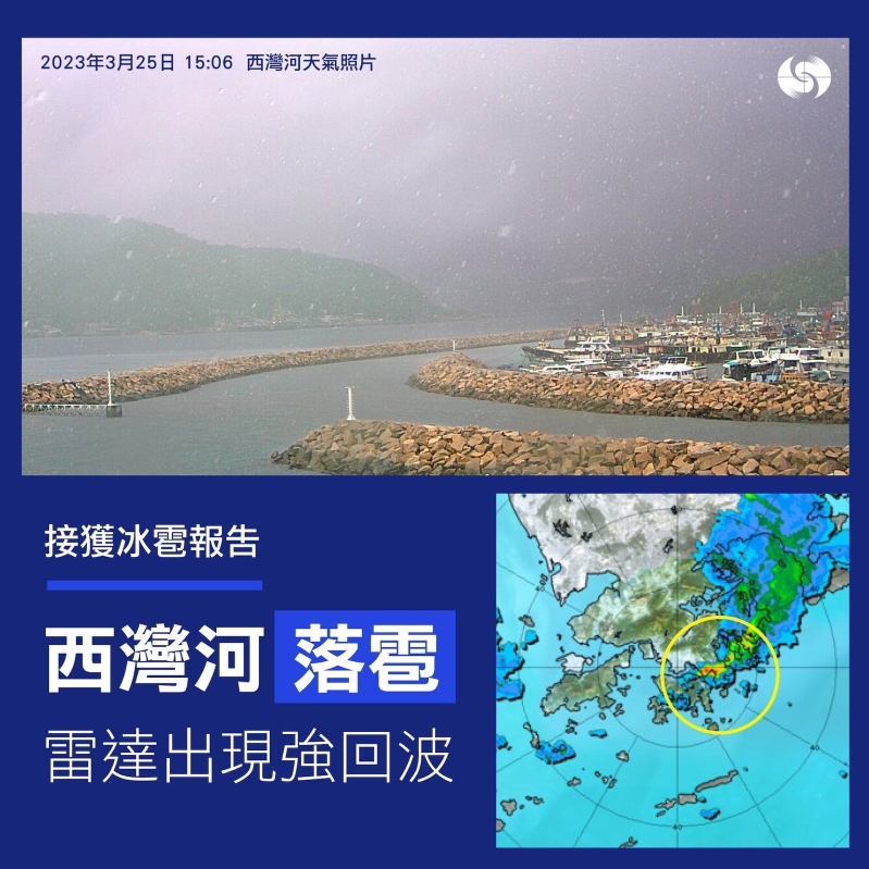 3月25日15時,香港天文台在西灣河拍到疑似冰雹。圖自香港天文台 香港天文台在社交平台表示,25日下午約3時曾在西灣河拍到疑似冰雹的相片,並接獲市民報告在當地看到落雹。天文台亦從雷達圖發現,西灣河在相近時間確實有強回波。根據天文台動畫顯示,落雹時間約為3時正至3時10分內。