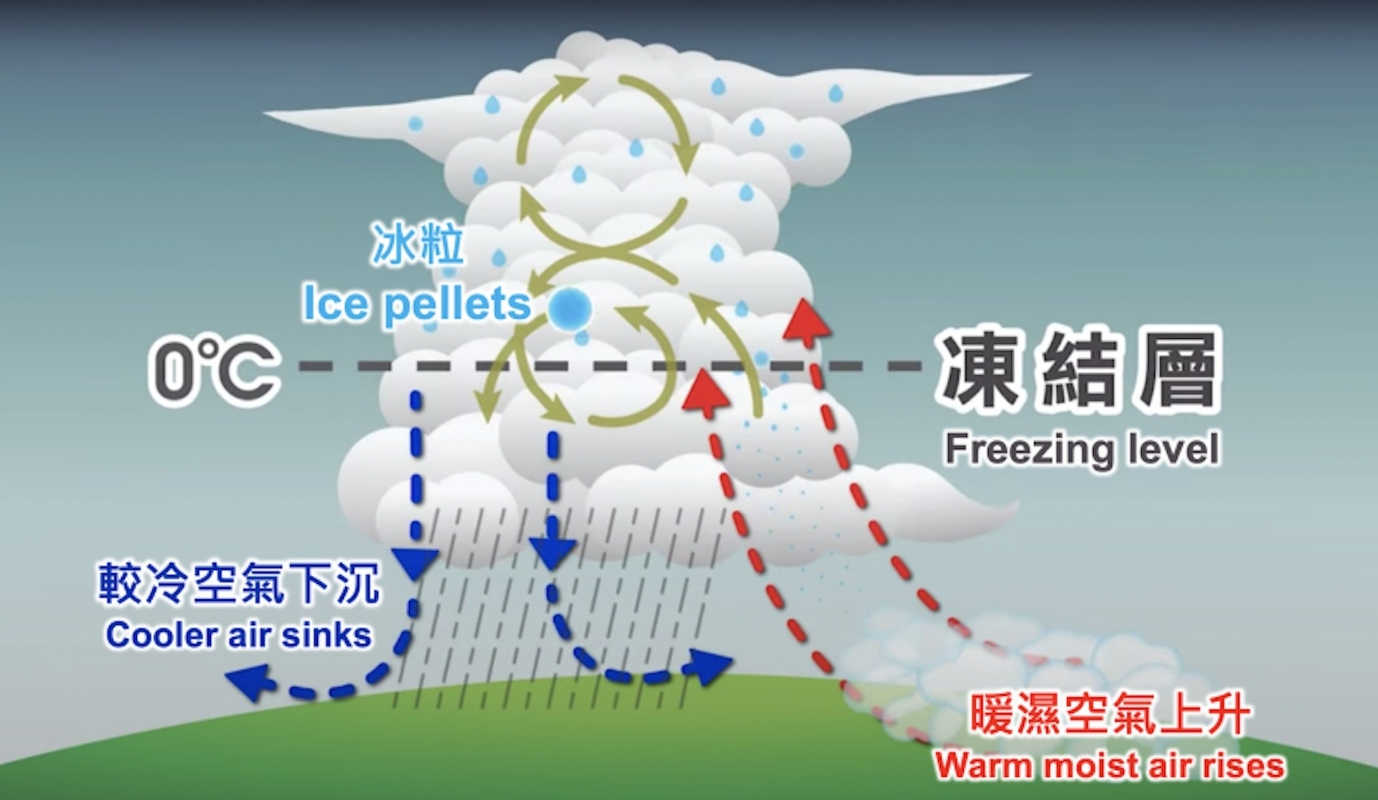 強雷暴引致落雹的過程。圖自香港天文台 天文台解釋,冰雹為強雷暴中產生的大冰粒,當較暖的濕空氣上昇時,空氣中的水份遇冷後凝結。由於上昇氣流猛烈,水氣會被帶到凍結層以上並不斷打滾,過程中像雪球愈滾愈大,並凝結成冰粒。最後上昇氣流不能再承托冰粒重量時,超重的冰粒便會跌落地面,形成落雹。 平均每1至2年才出現一次落冰雹 據香港天文台網頁曾介紹,落雹在香港並不常見,平均每1至2年才出現一次。在過去20年(2000年1月至2020年8月),共錄得11日冰雹報告。 近年較大規模的一次,發生於2014年3月30日晚上,在當日發出黑色暴雨警告信號期間,天文台收到多處地區的報告,大部份稱冰雹體積約20至30毫米,2021年將軍澳地區也記錄到一次落冰雹。(完)