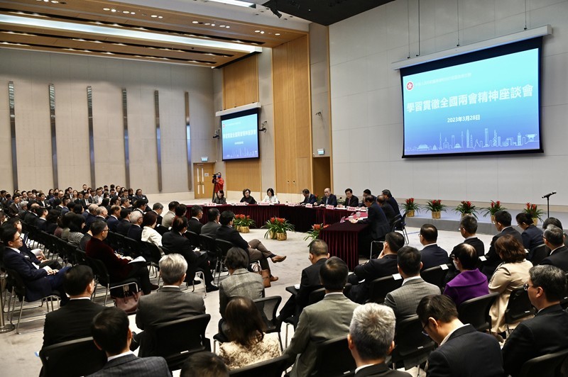 香港新聞網3月28日電 香港特區政府28日在政府總部舉辦座談會,讓與會者更深入了解全國兩會的重要內容及對香港未來發展的意義。 座談會由行政長官李家超主持,香港中聯辦主任鄭雁雄應邀出席,並作分享發言。約180人出席座談會,包括司局長等特區政府主要官員、行政會議成員、立法會議員、常任秘書長及部門首長等。
