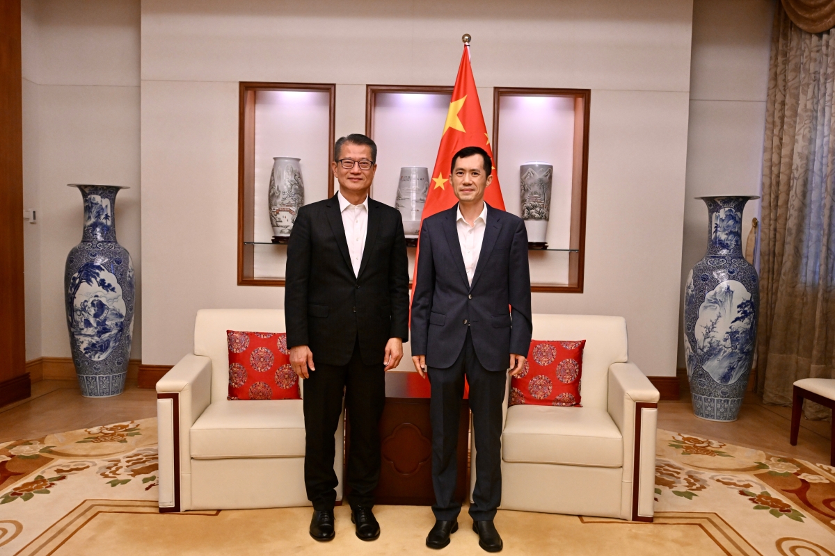 陳茂波(左)禮節性拜會中華人民共和國駐新加坡大使館公使張徐民(右)。 陳茂波說,在國家追求高質量發展、東盟國家普遍推動數字經濟、綠色轉型之際,香港憑著國家的堅實支持,將繼續積極發展和貫徹“八大中心”的功能,充分利用粵港澳大灣區的優勢,為整個亞洲地區發展作出貢獻,特別是助力推動區域的綠色金融、綠色科技和金融創新發展。 陳茂波隨後與新加坡副總理兼財政部長黃循財會面,就環球市場發展和宏觀經濟形勢交流看法。 黃循財事後在社交平台上傳與陳茂波的合照,提及外界喜歡用競爭來形容新加坡及香港關係,但他認為這並非零和博弈,兩地以競爭能推動雙方走向卓越,相信兩地會繼續在多個領域進行合作、交換意見。
